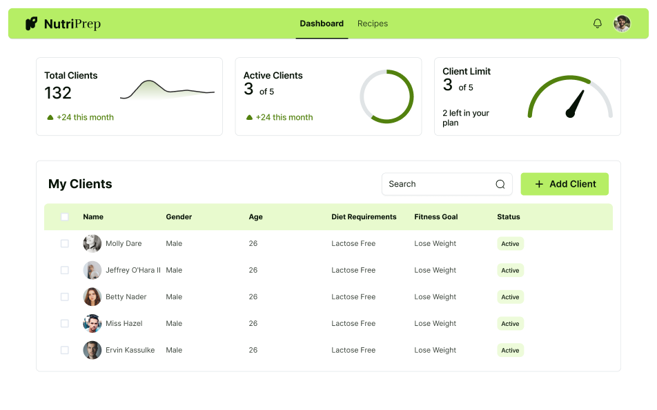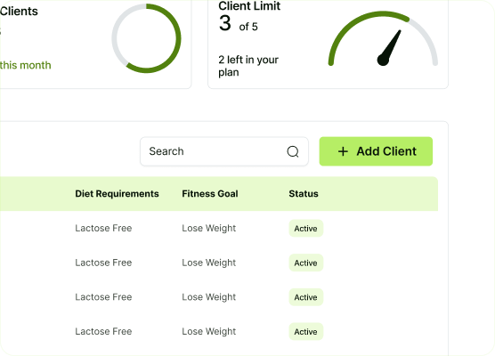 Streamline your client management with our user-friendly dashboard that keeps all your client information and meal plans in one accessible place.